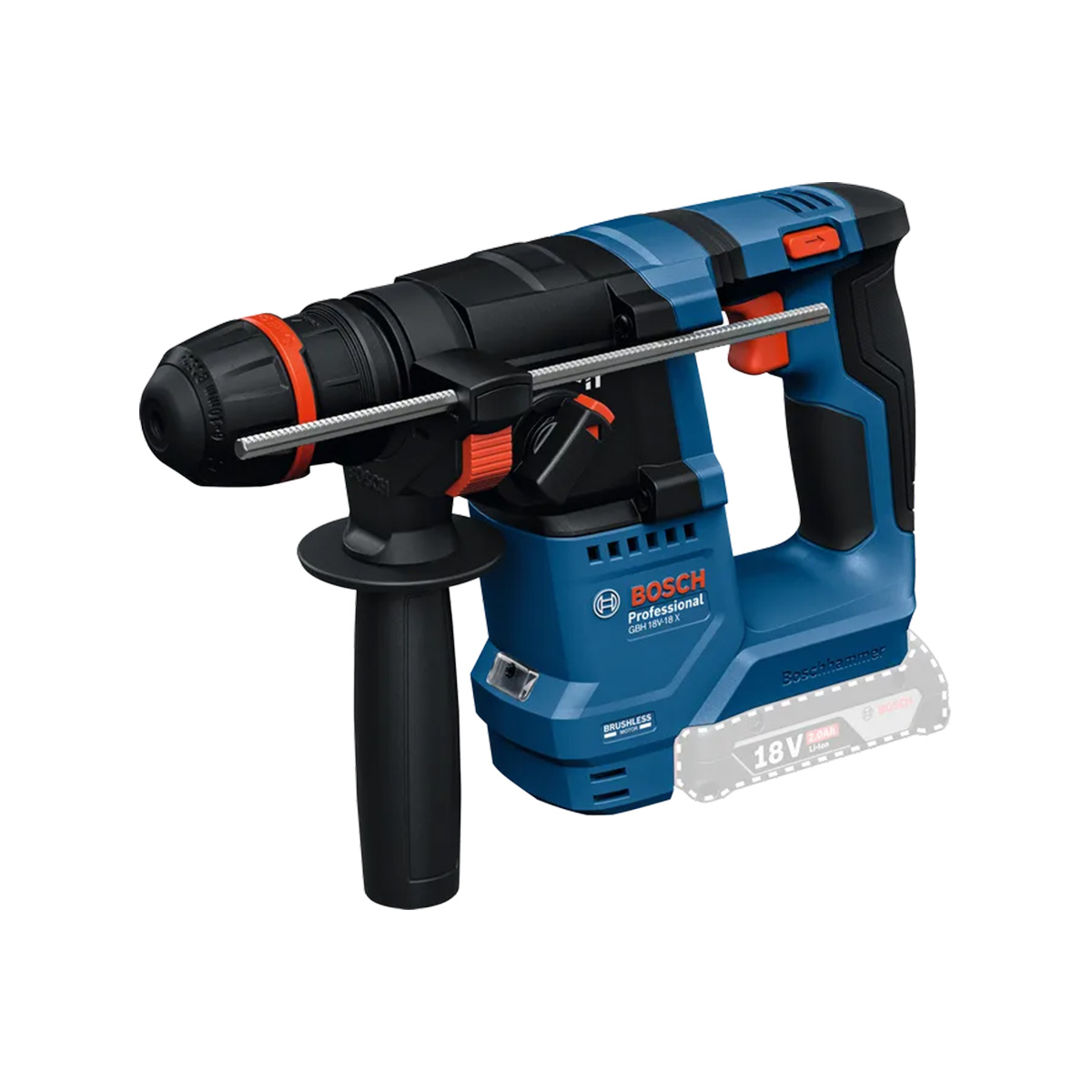 - Το περιστροφικό πιστολέτο GBH 18V-18 X Bosch Professional διατίθεται με έναν στιβαρό κινητήρα χωρίς ψήκτρες και με ONECHUCK, που ταιριάζει με SDS plus, κυλινδρικά και εξάγωνα τρυπάνια, για αυτό μπορεί να χρησιμοποιηθεί για τρύπημα με κρούση σε μπετόν και τρύπημα σε ξύλο ή μέταλλο.