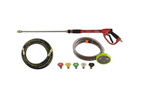 - Με πλήρη εξοπλισμό: επαγγελματικό πιστόλι με σκανδάλη ασφαλείας, σωλήνα υψηλής πίεσης 10 μέτρων, σωλήνα αναρρόφησης απορρυπαντικού, ακροφύσια (0ο, 15ο, 25ο, 40ο και μπεκ απορρυπαντικού), ακροφύσιο σύνδεσης νερού, φίλτρο εισαγωγής νερού.
