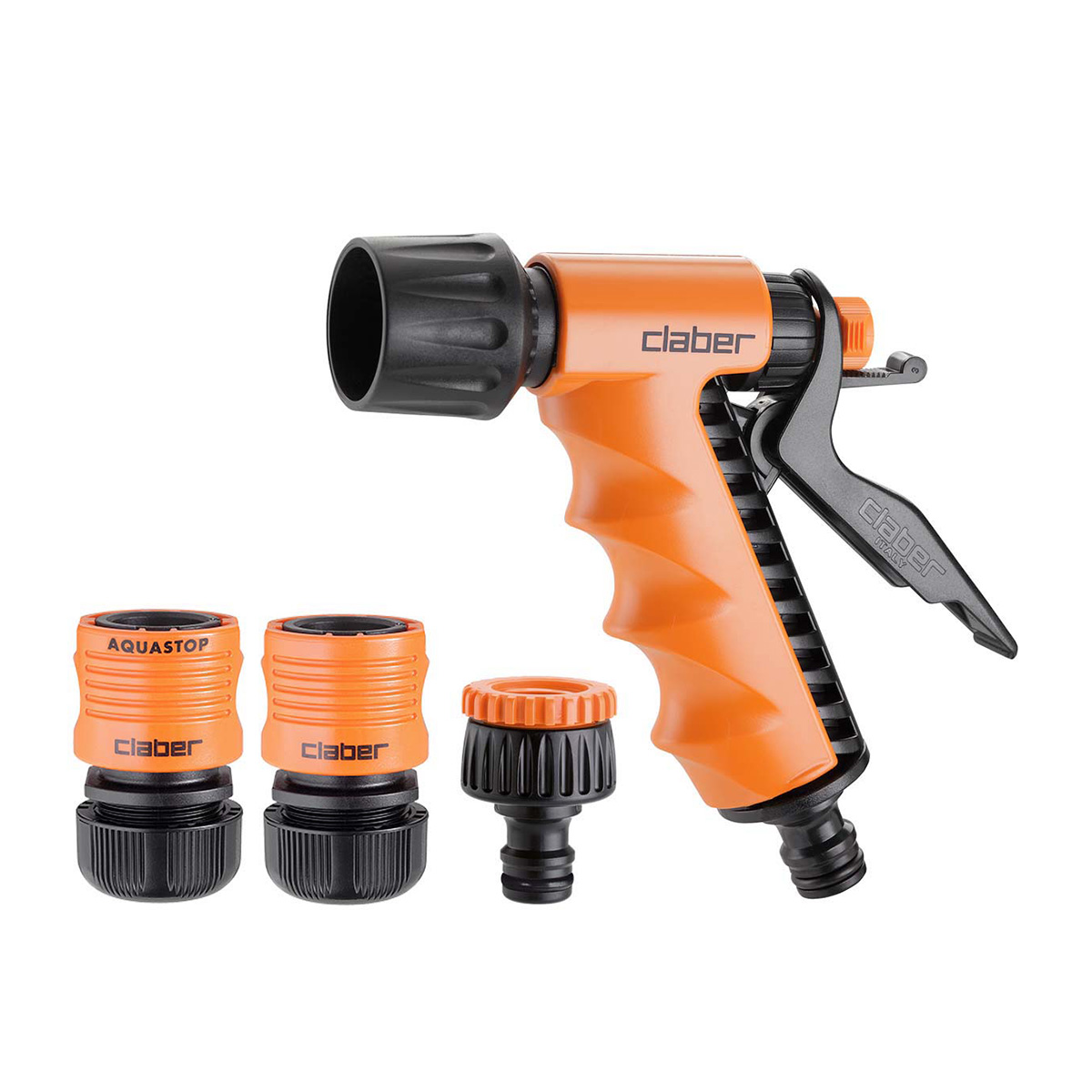 Περιλαμβάνει πιστόλι ψεκασμού με εργονομική λαβή, ρύθμιση και κλειδώμα της δέσμης νερού, η οποία είναι πολύ χρήσιμη για την αποφυγή της κόπωσης των χεριών, ένα βύσμα σύνδεσης 3/4 "με 1/2 "μειωτήρα που είναι εύκολο να εγκαταστήσετε χωρίς εργαλεία, δύο αυτόματες συνδέσεις Quick-Click, μία με τη συσκευή Aquastop, που σας επιτρέπει να συνδέσετε και να αποσυνδέσετε το πιστόλι χωρίς να χρειάζεται να κλείσετε τη βρύση.
