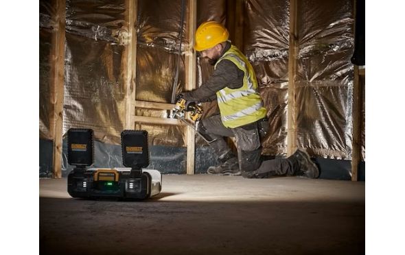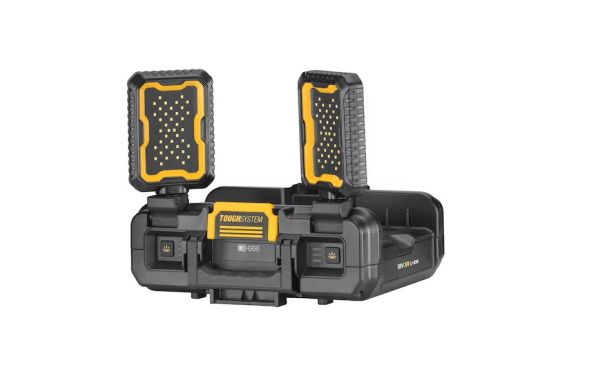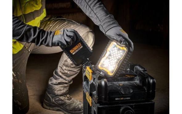 - Τροφοδοτούμενο από μπαταρίες 18V XR, το φως μπορεί να λειτουργήσει από το πάτωμα, πάνω από έναν πύργο κουτιού ToughSystem ή από ένα τρίποδο φωτισμού.