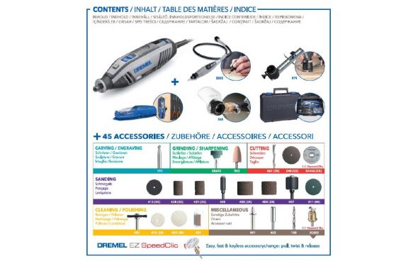 - Εκτελέστε την ευρύτερη γκάμα εφαρμογών σε οποιοδήποτε υλικό χάρη στη συμβατότητά του με όλα τα εξαρτήματα και προσαρτήματα της Dremel, συμπεριλαμβανομένου του EZ SpeedClicκαι της νέας γκάμας των εξαιρετικά ανθεκτικών εξαρτημάτων Dremel MAX.