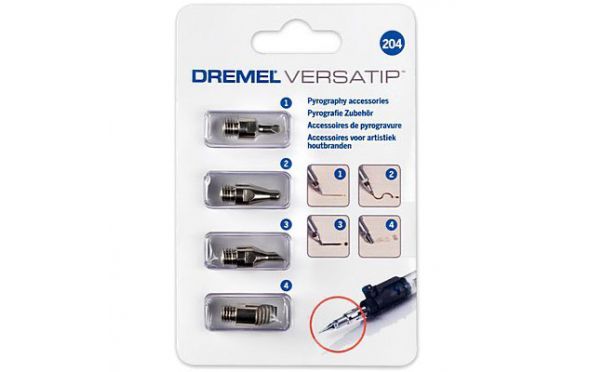 Αυτά τα νέα εξαρτήματα πυρογραφίας Dremel χρησιμοποιούνται για την εφαρμογή διαφορετικών μοτίβων πυρογραφίας πάνω σε ξύλο και δέρμα. Το σετ συμπεριλαμβάνει τέσσερις μύτες με διαφορετικές μορφές: σφαιρικό άκρο, οβάλ, αιχμηρό άκρο και αντιγραφής. Οι εφαρμογές συμπεριλαμβάνουν σχέδιο, σκίαση, χάραξη, κ.α. Όλες οι μύτες πρέπει να χρησιμοποιούνται με το Dremel® Versatip™.