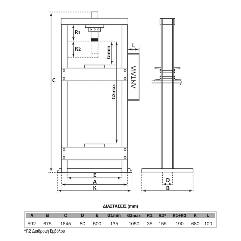 - Διαδρομή εμβόλου 175mm Ασκούμενης Πίεσης 12 ton.