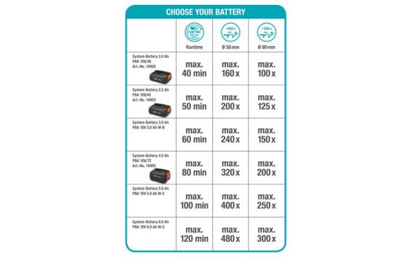 - Με την μπαταρία των 2,5Ah 18V, ο χρόνος λειτουργίας είναι έως 50 λεπτά ή έως και 200 ??κομμάτια κλαδιών με διάμετρο 50 χιλιοστών.