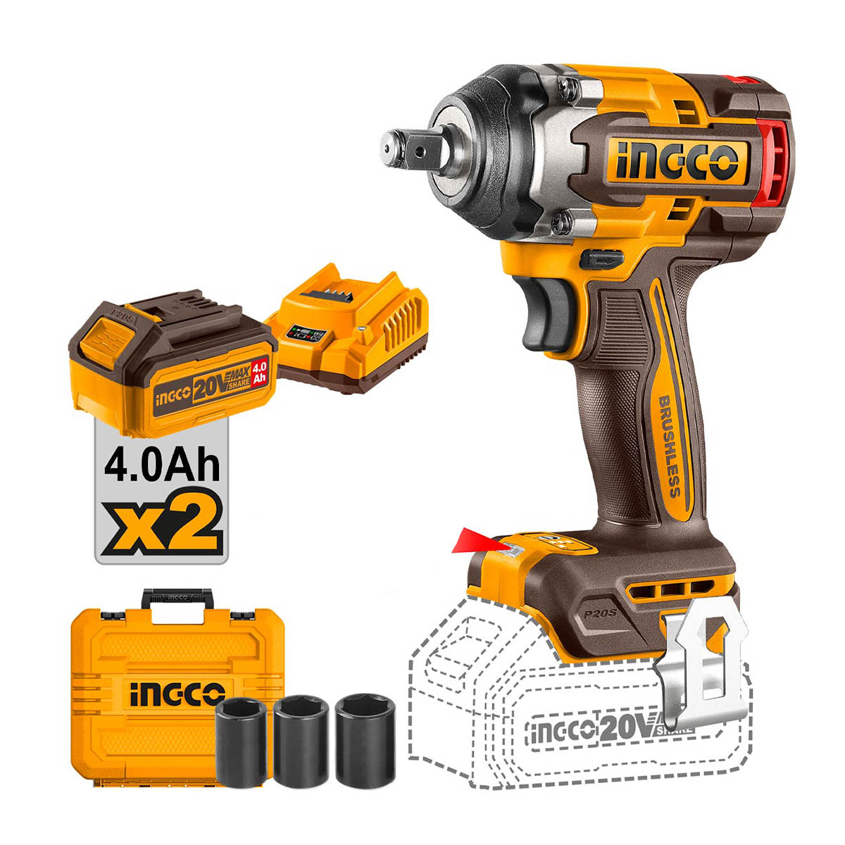 Ingco - CIWLI2050E Κρουστικό Μπουλονόκλειδο Μπαταρίας 20V Li-Ion Brushless (2x4.0Ah)