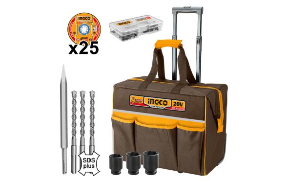 Ingco - CKLI2059E Σετ Κρουστικό Δραπανοκατσάβιδο Μπουλονόκλειδο Πιστολέτο Γωνιακός Τροχός & Φακός Μπαταρίας 20V Li-Ion με Εξαρτήματα & Τροχήλατη Εργαλειοθήκη (2x4.0Ah)