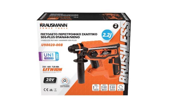 Πιστολέτο περιστροφικό SDS-Plus επαναφορτιζόμενο KRAUSMANN® U98020-00B, ιδανικό για κρουστική διάτρηση σε τσιμέντο, πέτρα, ξύλο και μέταλλο, καθώς και για ελαφρές σκαπτικές και κατεδαφιστικές εργασίες.