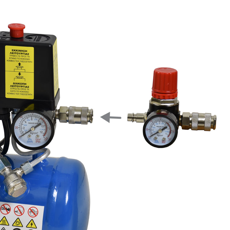 - Ρυθμιστής πιέσεως ρυθμιζόμενος από 0 έως 8 bar με 1 εξόδο με ταχυσύνδεση.