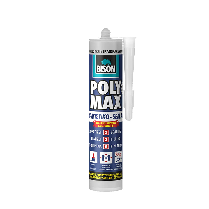 - Το BISON Poly Max® Sealant είναι ένα υψηλής ποιότητας, μόνιμα ελαστικό, βαφόμενο και ανθεκτικό στη μούχλα σφραγιστικό "όλα σε ένα" (μπορεί να αντικαταστήσει τα ακρυλικά, σιλικονούχα και PU σφραγιστικά) για αδιάβροχη σφράγιση αρμών και ραφών, γέμισμα οπών και ρωγμών χωρίς συρρίκνωση και φινίρισμα εργασιών σφράγισης με αισθητικό τρόπο.