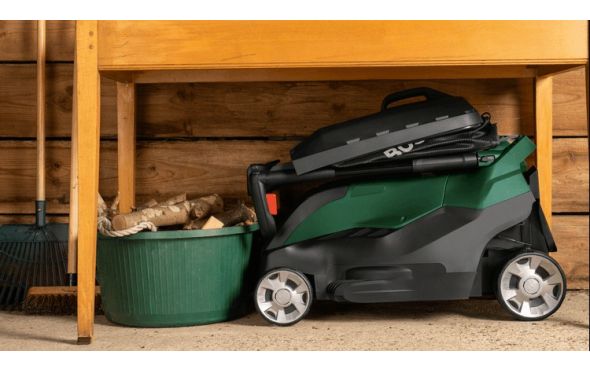 - Μόλις τελειώσει το γκαζόν, ο πτυσσόμενος σάκος χλόης και το Ergoslide επιτρέπουν τη συμπαγή αποθήκευση του χλοοκοπτικού.