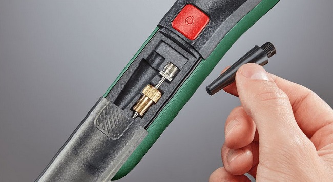 - Τέλεια προετοιμασία για οποιαδήποτε εργασία - Η ενσωματωμένη αποθήκευση των εξαρτημάτων διαθέτει μια επιλογή από τους πιο συνηθισμένους προσαρμογείς (βελόνα μπάλας, γαλλικός προσαρμογέας βαλβίδας, προσαρμογέας μπαλονιού), προσεκτικά αποθηκευμένους σε μια θήκη.