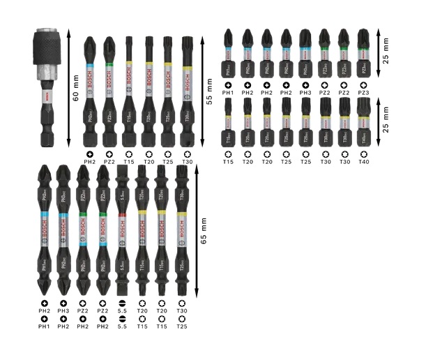| Κατσαβιδόλαμα 55 mm: PH2, PZ2, T15, T20, T25, T30 |