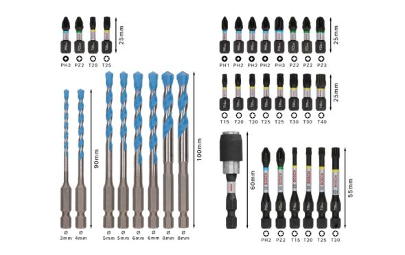 | Κατσαβιδόλαμα 25 mm: PH1, PH2 (4x), PH3, PZ2 (3x), PZ3, T15, T20 (3x), T25 (3x), T30 (2x), T40 |