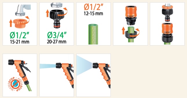 Περιλαμβάνει πιστόλι ψεκασμού με εργονομική λαβή, ρύθμιση και κλειδώμα της δέσμης νερού, η οποία είναι πολύ χρήσιμη για την αποφυγή της κόπωσης των χεριών, ένα βύσμα σύνδεσης 3/4 "με 1/2 "μειωτήρα που είναι εύκολο να εγκαταστήσετε χωρίς εργαλεία, δύο αυτόματες συνδέσεις Quick-Click, μία με τη συσκευή Aquastop, που σας επιτρέπει να συνδέσετε και να αποσυνδέσετε το πιστόλι χωρίς να χρειάζεται να κλείσετε τη βρύση.