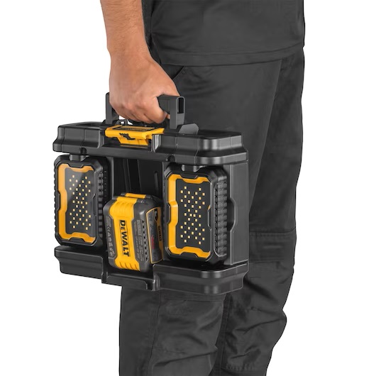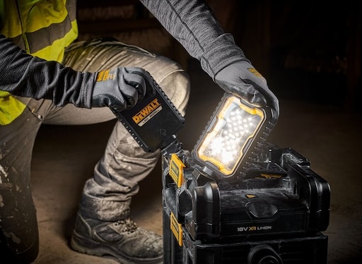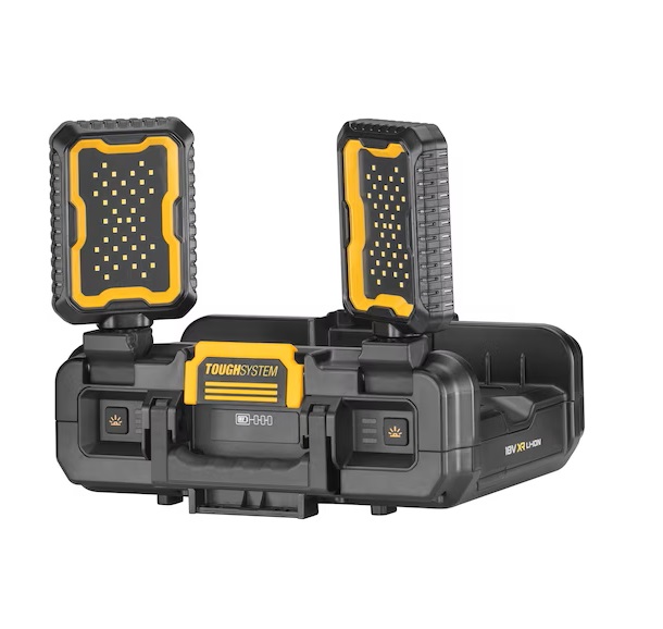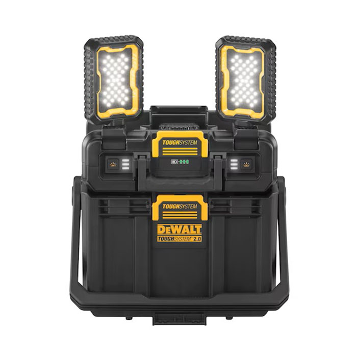 - Τροφοδοτούμενο από μπαταρίες 18V XR, το φως μπορεί να λειτουργήσει από το πάτωμα, πάνω από έναν πύργο κουτιού ToughSystem ή από ένα τρίποδο φωτισμού.