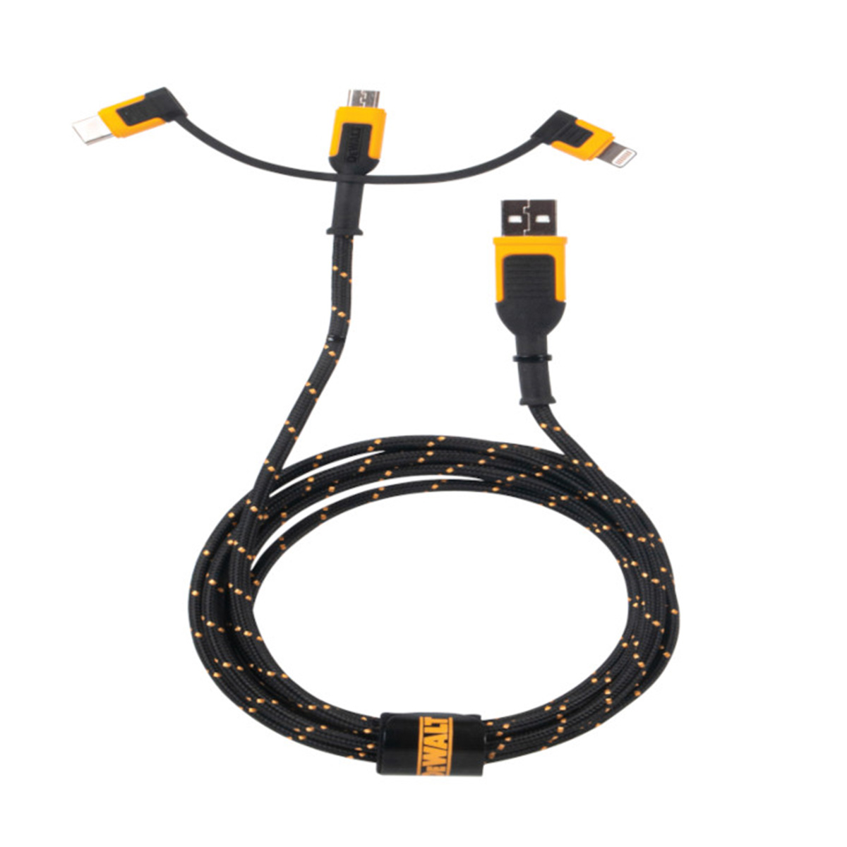 - Το Dewalt 1311356DWG καλώδιο είναι ένα εξαιρετικά ανθεκτικό καλώδιο φόρτισης “3-σε-1” μήκους 1.8m, που καλύπτει τις υποδοχές USB-A → USB-C, Lightning και Micro-USB.