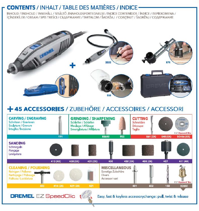 | 45 εξαρτήματα της Dremel (191, 85602, 952, 561 x 2, 540 x 5, SC56 x 5, 413 x 4, 438 x 3, 431 x 2, 430, 432 x 3, 408 x 2, 407, 411 x 4, 403, 414 x 2, 429 x 2, 421, 401, 402, 150, SC402) |