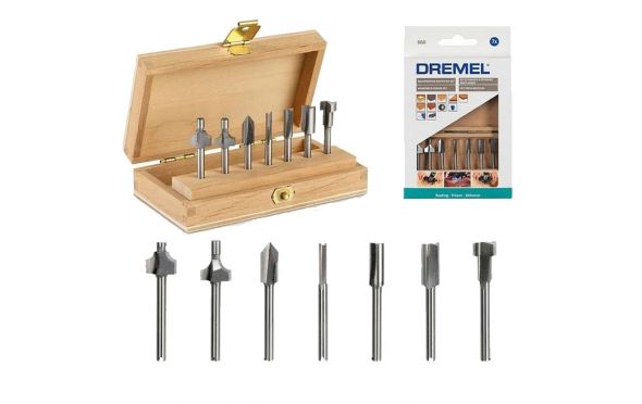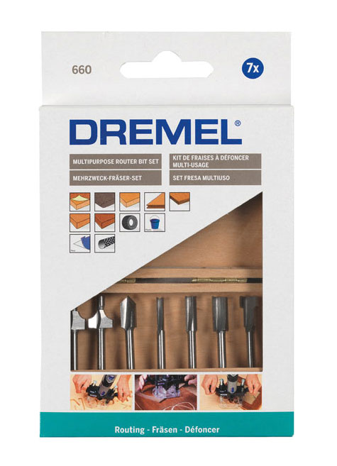 Το σετ φρέζας διαμόρφωσης πολλαπλής χρήσης 7 τεμαχίων της Dremel περιλαμβάνει και τα επτά αξεσουάρ φρεζαρίσματος υψηλής ποιότητας της Dremel. Με αυτό το σετ εξαρτημάτων μπορείτε να εκτελέσετε ένα ευρύ φάσμα εφαρμογών φρεζαρίσματος: Ακμή, γωνία, ευθεία, κλειδαρότρυπα, φρεζάρισμα λέξεων και γραμμάτων σε μια πληθώρα υλικών συμπεριλαμβανομένου, όμως όχι περιορισμένου σε, σκληρό ξύλο, μαλακό ξύλο, καπλαμά και κοντραπλακέ. Φρεζάρετε υποδοχές στις πόρτες για να στερεώσετε νέες λαβές πόρτας, σχεδιάστε και φρεζάρετε τα δικά σας ντουλάπια κουζίνας ή δημιουργήστε τον δικό σας αριθμό σπιτιού. Αποθηκεύστε άνετα τις φρέζες σας στο συμπεριλαμβανόμενο ξύλινο κιβώτιο.
