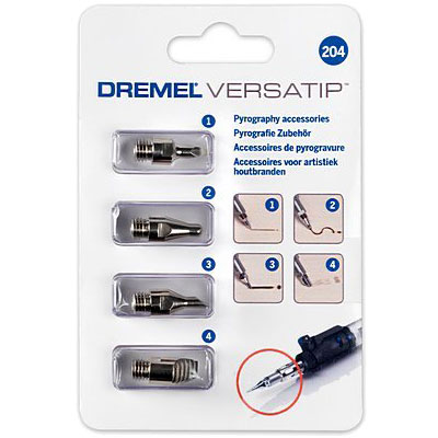 Αυτά τα νέα εξαρτήματα πυρογραφίας Dremel χρησιμοποιούνται για την εφαρμογή διαφορετικών μοτίβων πυρογραφίας πάνω σε ξύλο και δέρμα. Το σετ συμπεριλαμβάνει τέσσερις μύτες με διαφορετικές μορφές: σφαιρικό άκρο, οβάλ, αιχμηρό άκρο και αντιγραφής. Οι εφαρμογές συμπεριλαμβάνουν σχέδιο, σκίαση, χάραξη, κ.α. Όλες οι μύτες πρέπει να χρησιμοποιούνται με το Dremel® Versatip™.