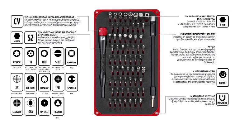 - Το σετ περιέχει πρόσθετα εργαλεία ακριβείας που διευρύνουν τη γκάμα των εργασιών που μπορούν να εκτελεστούν.