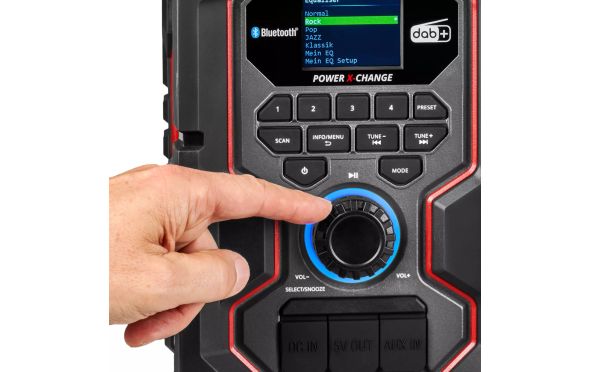 Μέλος της οικογένειας Power X-Change.Υβριδική λειτουργία: Το ραδιόφωνο μπορεί να χρησιμοποιηθεί με μπαταρία ή πρίζα.Οθόνη TFT: ευκρινής, έγχρωμη και με οπίσθιο φωτισμό.30 μνήμες για σταθμούς DAB+ και FM.Λειτουργία αυτόματης αναζήτησης για εύκολη αναζήτηση σταθμών.Λειτουργία RDS: Πληροφορίες για σταθμούς, τραγούδια και κίνηση.Πρόσθετη αναπαραγωγή μουσικής μέσω Bluetooth, AUX ή USB.Ισοσταθμιστής για εξατομικευμένη ρύθμιση μπάσων και πρίμων.Στιβαρή αναδιπλούμενη κεραία για τέλεια λήψη.Ανθεκτικό περίβλημα με πλαίσιο απορρόφησης κραδασμών.Κατηγορία IP65: Προστατεύεται από τη σκόνη και το πιτσίλισμα νερού.Θύρα USB-Out για φόρτιση εξωτερικών συσκευών.Λειτουργία ύπνου για αυτόματη απενεργοποίηση του ραδιοφώνου.2 μεγάλα ηχεία για υψηλή ποιότητα στερεοφωνικού...