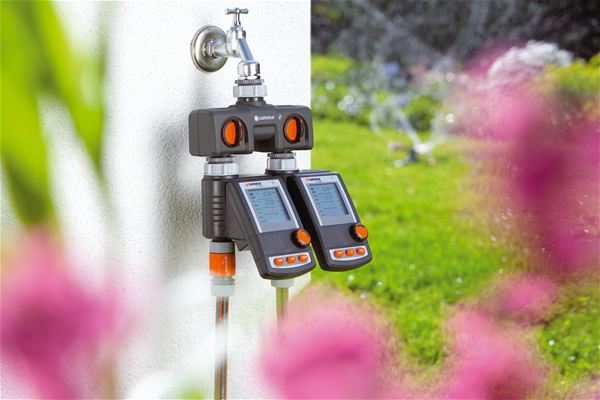 - Με τη διπλή παροχή της GARDENA είναι εφικτή η ταυτόχρονη σύνδεση δύο ποτιστικών συσκευών σε μία βρύση. Οι έξοδοι είναι πλήρως ρυθμιζόμενες. Μπορείτε να συνδέσετε σε αυτές δύο προγραμματιστές αυτόματου ποτίσματος GARDENA.