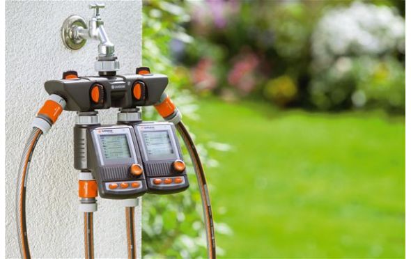 Στην τετραπλή παροχή μπορείτε να συνδέσετε δύο προγραμματιστές ή χρονοδιακόπτες ποτίσματος GARDENA. Η τετραπλή παροχή μπορεί να μετατραπεί σε σύστημα μέγιστης ροής Profi GARDENA με το ρακόρ με σπείρωμα του συστήματος μέγιστης ροής Profi (Κωδ. πρ. 2801-20).