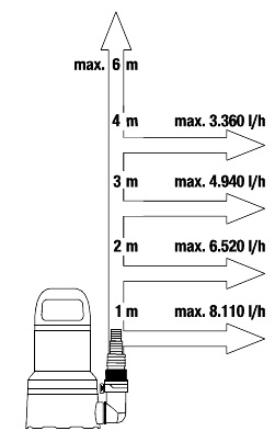 - Με μέγιστη πίεση 0,6 bar και βάθος βύθισης 6 m, μπορούν να αντληθούν έως και 9000 λίτρα νερού ανά ώρα.