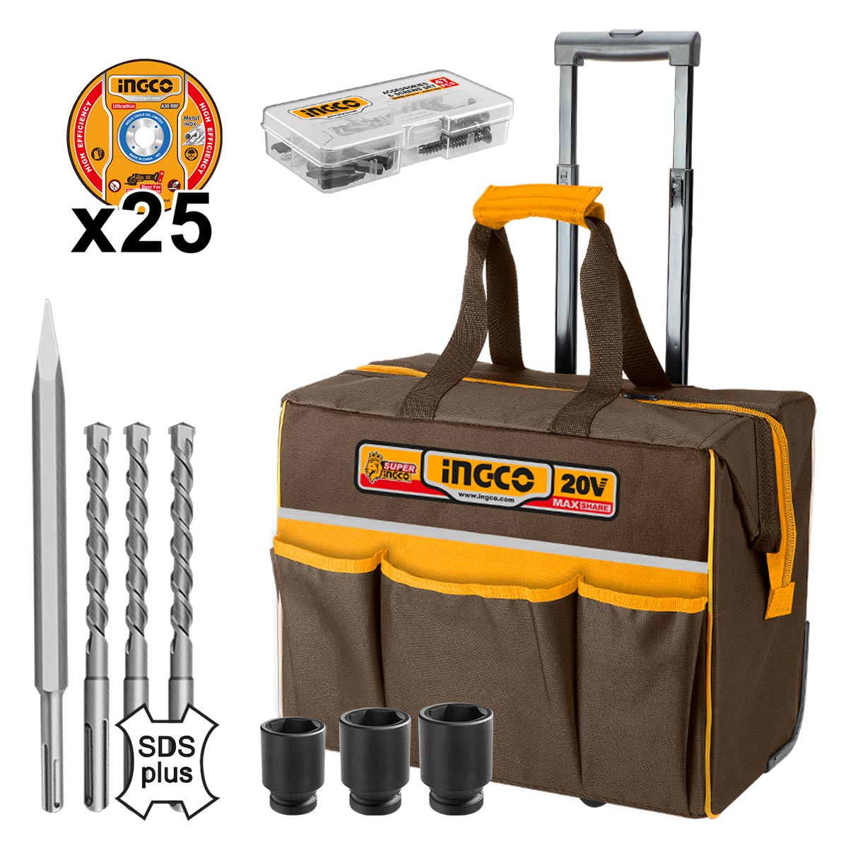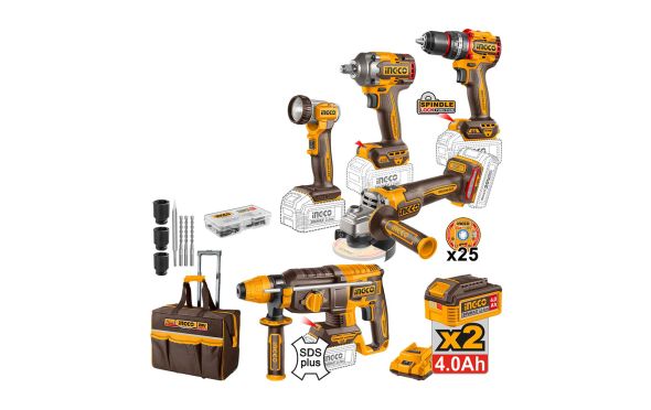 Ingco - CKLI2059E Σετ Κρουστικό Δραπανοκατσάβιδο Μπουλονόκλειδο Πιστολέτο Γωνιακός Τροχός & Φακός Μπαταρίας 20V Li-Ion με Εξαρτήματα & Τροχήλατη Εργαλειοθήκη (2x4.0Ah)