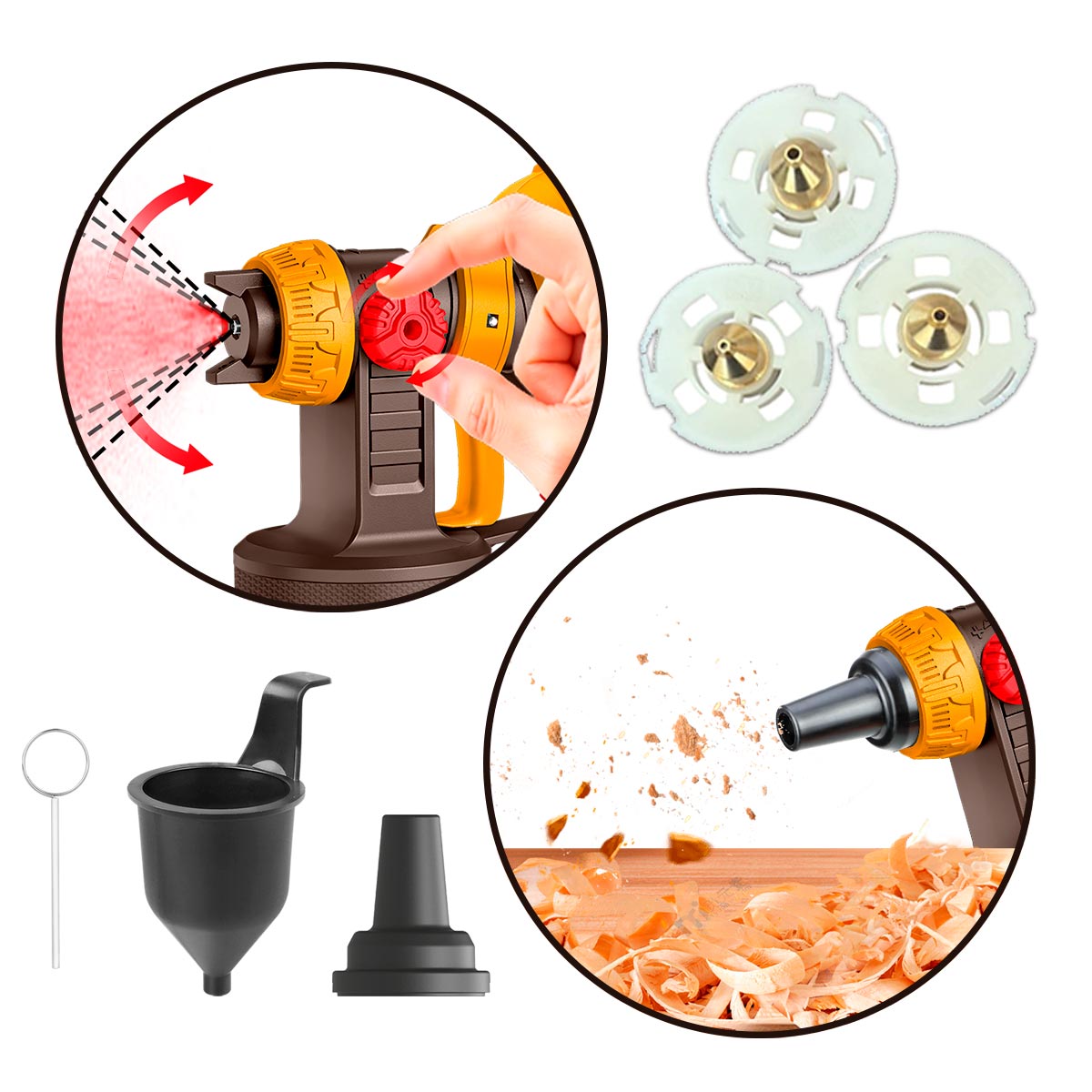 Ρυθμιζόμενο πλάτος ψεκασμού.Λειτουργία φυσητήρα.Με το πάτημα ενός κουμπιού διαιρείται στα δυο (μπέκ και κινητήρας) για τον καλύτερο καθαρισμό του μπεκ χωρίς να έρχεται σε επαφή με υγρά καθαρισμού ο κινητήρας.Το εργαλείο προορίζεται για βαφή, με χρώματα με βάση διαλύτες και με βάση το νερό, αστάρια, χρώματα δύο συστατικών, βερνίκια, χρώματα φινιρίσματος, χρώματα αυτοκινήτων, χρώματα νεφτιού, και συντηρητικά ξύλου. Απαραίτητη προϋπόθεση είναι ένας καλός καθαρισμός μετά από κάθε χρήση.