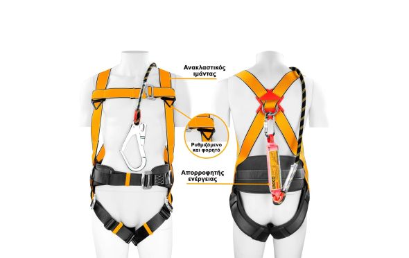 Υλικό: Πολυεστέρας υψηλής αντοχής.3 σημεία προσάρτησης. 4 σημεία ρύθμισης. Προσαρμόζονται στο στήθος, στη μέση και στους μηρούς κάθε χρήστη. Επενδυμένη ζώνη μέσης και ιμάντας μηρού. Ανατομικό πάνελ πλάτης με D-Ring. Ρυθμιζόμενο λουράκι στο στήθος.Πιστοποιητικό Ασφαλείας: EN358: 2018, EN361: 2002.