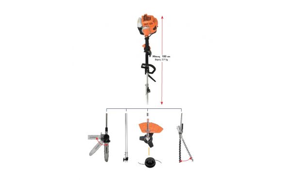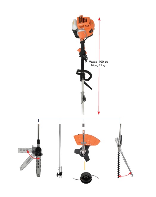 Μπορεί να δεχτεί 4 διαφορετικά εξαρτήματα: θαμνοκοπτικό, κονταροπρίονο, ψαλίδι μπορντούρας και προέκταση.
