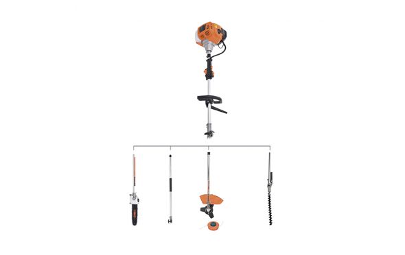 Μπορεί να δεχτεί 4 διαφορετικά εξαρτήματα: θαμνοκοπτικό, κονταροπρίονο, ψαλίδι μπορντούρας και προέκταση.