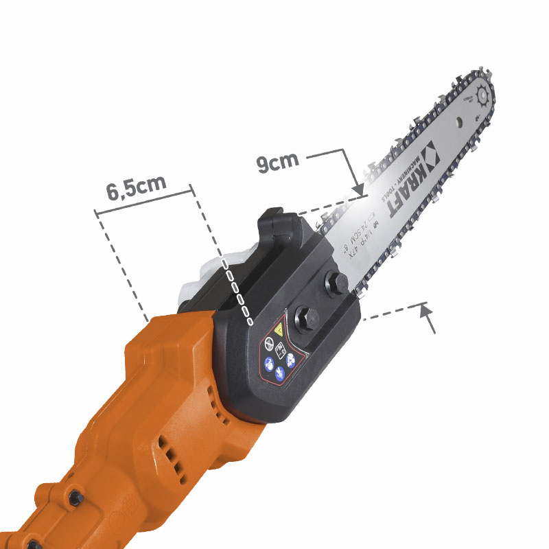 - Κονταροπρίονο μπαταρίας KRAFT νέου σχεδιασμού , περιορισμένου όγκου με τηλεσκοπικό μηχανισμό , πολύ ελαφρύ μόλις 3 kg ,ευέλικτο, παραγωγικό με στιβαρή μεταλλική κατσκευσή μειώτηρα για διευκόλυνση των κοπών ακόμα και στα πιο στενά σήμεια.