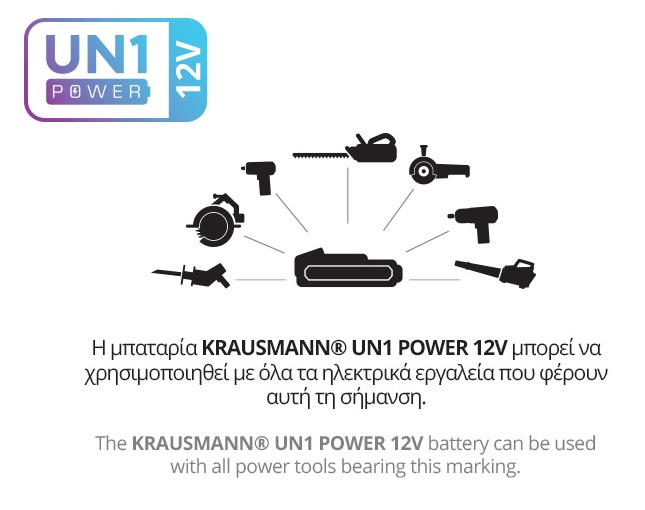 - UN1 POWER - Η μπαταρία KRAUSMANN® UN1 POWER 12V μπορεί να χρησιμοποιηθεί με όλα τα ηλεκτρικά εργαλεία που φέρουν αυτή τη σήμανση.