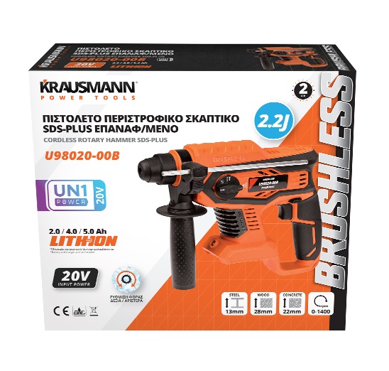 Πιστολέτο περιστροφικό SDS-Plus επαναφορτιζόμενο KRAUSMANN® U98020-00B, ιδανικό για κρουστική διάτρηση σε τσιμέντο, πέτρα, ξύλο και μέταλλο, καθώς και για ελαφρές σκαπτικές και κατεδαφιστικές εργασίες.