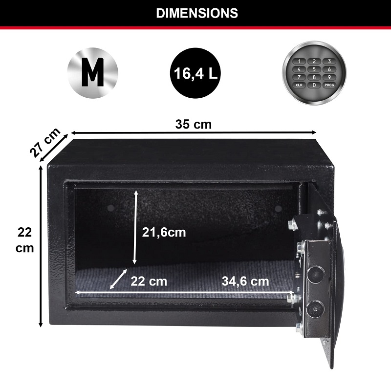 - Η προγραμματιζόμενη ηλεκτρονική κλειδαριά σας επιτρέπει να επιλέξετε τον συνδυασμό σας, ενώ το έξτρα κλειδί διασφαλίζει ότι θα έχετε πάντα πρόσβαση στο χρηματοκιβώτιο σας, ακόμα και στην περίπτωση που ξεχάσετε τον συνδυασμό.