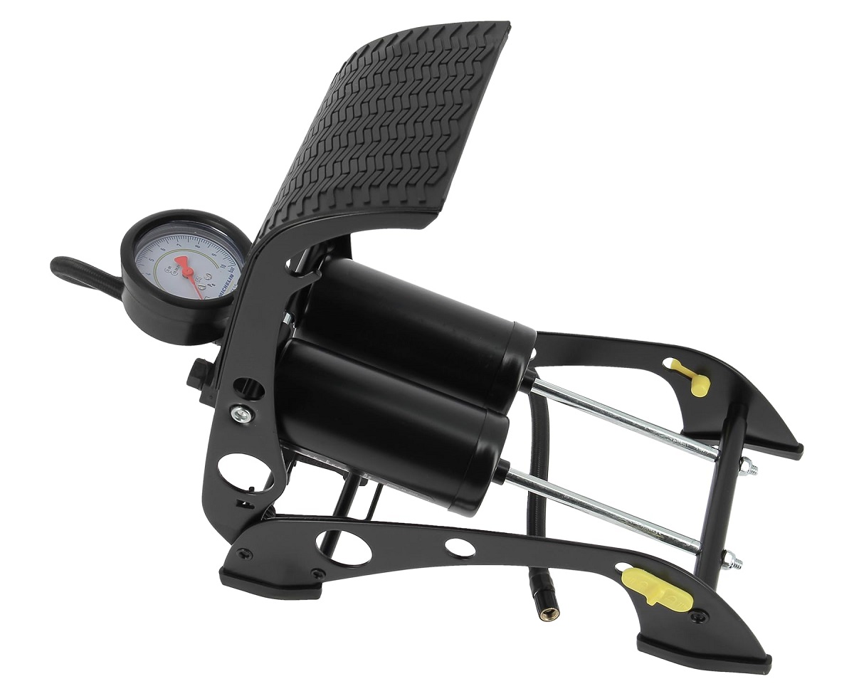 Τρόμπα ποδιού με πιστοποιημένο μανόμετρο για ακριβή ρύθμιση της πίεσης στα λάστιχα. Μέγιστη πίεση 7 bars. Με διπλό έμβολο για υψηλές επιδόσεις και σωλήνα 80 εκατοστών για όλους τους τύπους ελαστικών έως και 19"". Μπρούτζινη βαλβίδα που βιδώνεται εύκολα στη βαλβίδα του ελαστικού για καλύτερο και ακριβέστερο φούσκωμα. Πλαστική βάση για καλύτερη σταθερότητα.