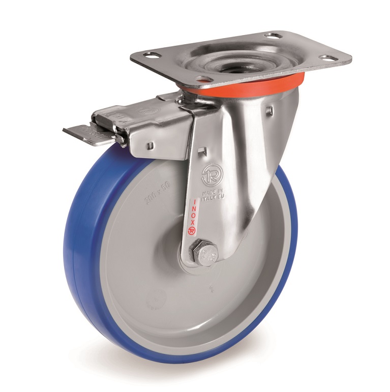Κατάλληλο για καρότσια και τα μηχανήματα με τα φορτία μεσαίου βαθμου, Κατάλληλο για εσωτερική και εξωτερική χρήση για συχνό πλύσιμο και αποστείρωση.Εξαιρετική αντίσταση κύλισης.Παραδείγματα συνιστώμενες εφαρμογές: καρότσια για βιομηχανική χρήση σε εσωτερικούς χώρους, σωληνοειδή καρότσια, καρότσια για τη βιομηχανία τροφίμων και χημικών.ΡΟΔΑ:Θερμοπλαστική πολυουρεθάνη.ΠΕΛΜΑ:INOX