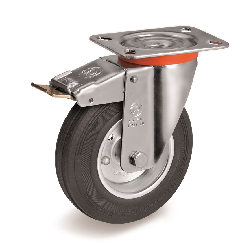 Κατάλληλο για καρότσια με ελαφρα φορτια, επίσης σε δαπεδα με ανωμαλω εδαφος. εσωτερική και εξωτερική χρηση.Συνιστατε σε εφαρμογές: καροτσάκια εργαλείων, καροτσάκια για βιομηχανική χρηση, μικρές κινητές σκαλωσιές, καδους κτλ.Ρόδα:ελαστικό πέλμα.Βάση:γαλβανιζε.