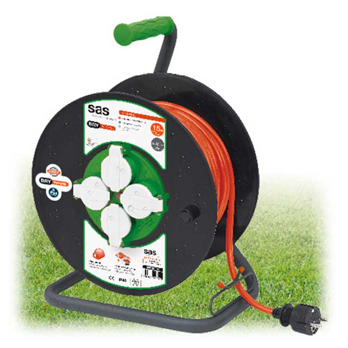 Το στροφείο εξωτερικών χώρων της sas διαθέτει 4 πρίζες σούκο ΙΡ44 με ειδικό λαστιχένιο κάλυμμα για προστασία από το νερό και λαστιχένιο καλώδιο H05RR-F. Χάρη στην τεχνολογία DRY και το ειδικό λαστιχένιο κάλυμμα, η χρήση του στροφείου γίνεται εύκολη και ασφαλής υπόθεση ακόμη και σε περιβάλλον βροχής, τρεχούμενου νερού και κατασκευές έργων που συνδέονται με την ύδρευση.