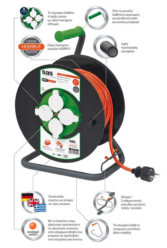 - Το στροφείο εξωτερικών χώρων της sas διαθέτει 4 πρίζες σούκο ΙΡ44 με ειδικό λαστιχένιο κάλυμμα για προστασία από το νερό και λαστιχένιο καλώδιο H05RR-F. Χάρη στην τεχνολογία DRY και το ειδικό λαστιχένιο κάλυμμα, η χρήση του στροφείου γίνεται εύκολη και ασφαλής υπόθεση ακόμη και σε περιβάλλον βροχής, τρεχούμενου νερού και κατασκευές έργων που συνδέονται με την ύδρευση.