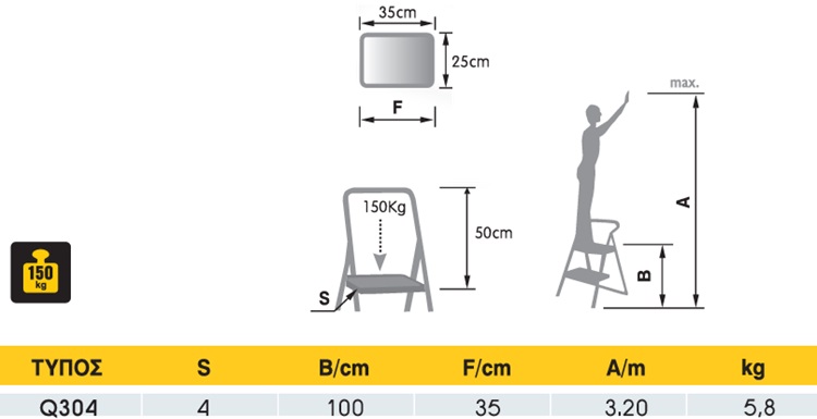 Προφίλ αλουμινίου (46x20mm) μέγιστης αντοχής με πάχος 1,2mmΠλαστικά πλατύσκαλα (35x25cm) αντιολισθητικά μέγιστης αντοχήςΧιαστή αλουμινίου σε όλα τα μεγέθηΌλα τα μονέλα είναι συσκευασμένα με αναλυτικές οδηγίες χρήσηςΗ σκάλα κατασκευάζεται σύμφωνα με τα ευρωπαϊκά πρότυπα EN131Μέγιστη αντοχή 150kg.