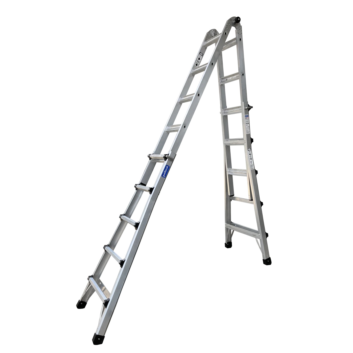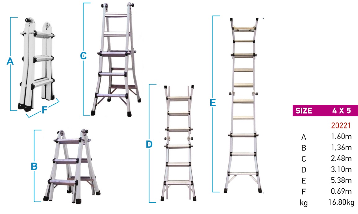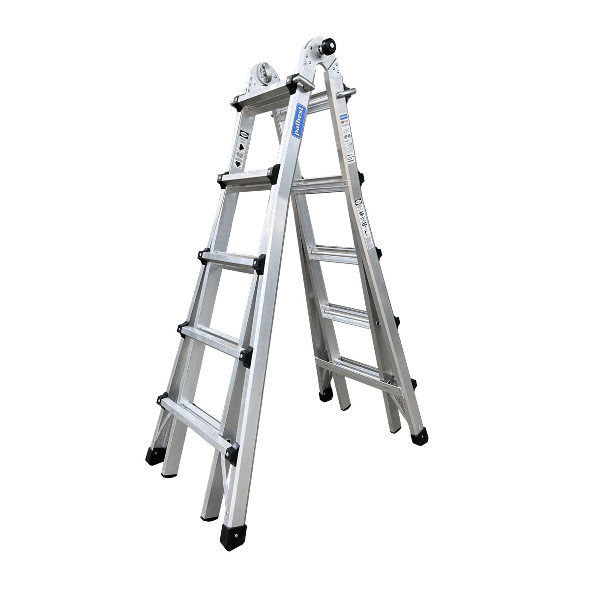 Σκάλα αλουμινίου με 2 αυτόματες ασφάλειες.Δυνατότητα σκάλας να διαμορφώνεται σε 5 διαφορετικές θέσεις κλειδώματος.Χρήση σε ανισόπεδο.Εύκολη στην μεταφορά και αποθήκευση λόγο μεγέθους.Η σκάλα παρέχει όλες τις ευρωπαϊκές προδιάγραφες ΕΝ131 Μέγιστη αντοχή 150kg.