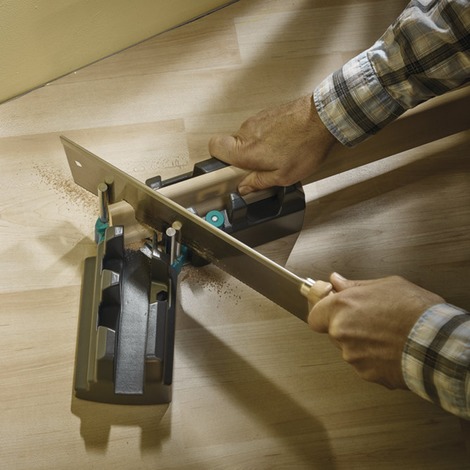Αυτόματη μεταφορά της σωστής γωνίας στο πριόνι χάρη στους ενσωματωμένους πείρους οδήγησης για το πριόνι χειρός (φαλτσογωνία).